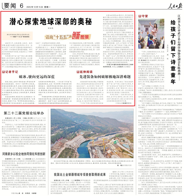 中国深海科研人员用最朴素的热爱,在地球的最北端凿开冰层,为探索地球深部奥秘打开一扇新的窗户。面向“十五五”,我们有理由相信,这份热爱将助力中国深海科研驶向更远的深蓝。
